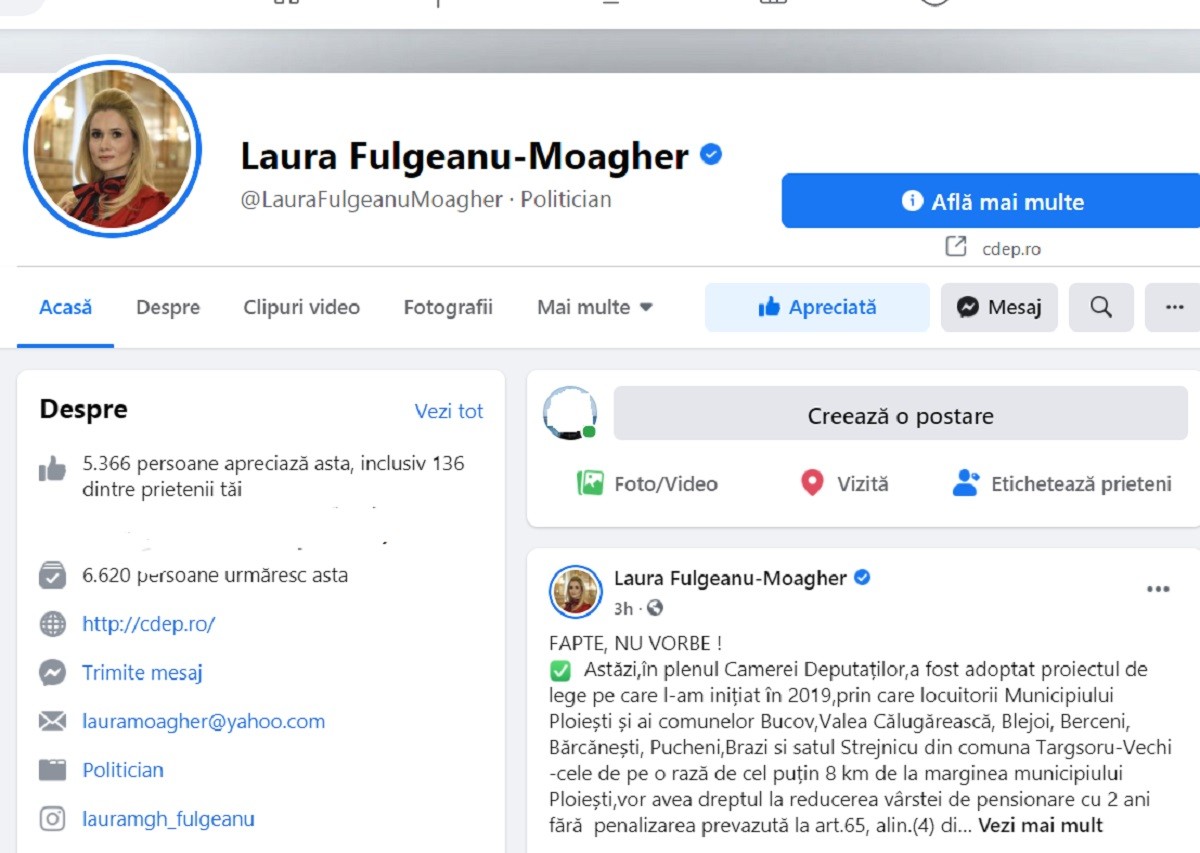Laura Fulgeanu-Moagher: „Astăzi, în plenul Camerei Deputaților, a fost adoptat proiectul de lege pe care l-am inițiat în 2019, prin care locuitorii municipiului Ploiești și ai localităților Bucov, Valea Călugărească, Blejoi, Berceni, Strejnic, Bărcănești, Pucheni și Brazi, pe o rază de cel puțin 8 km de la marginea municipiului Ploiești, vor avea dreptul la reducerea vârstei de pensionare cu 2 ani, fără penalizarea prevăzută la art.65, alin.(4) din Legea 263/2010 privind sistemul unitar de pensii publice. S-a făcut dreptate pentru ploieșteni și pentru locuitorii din jurul Ploieștiului, prin includerea municipiului în lista zonelor afectate de poluare”.