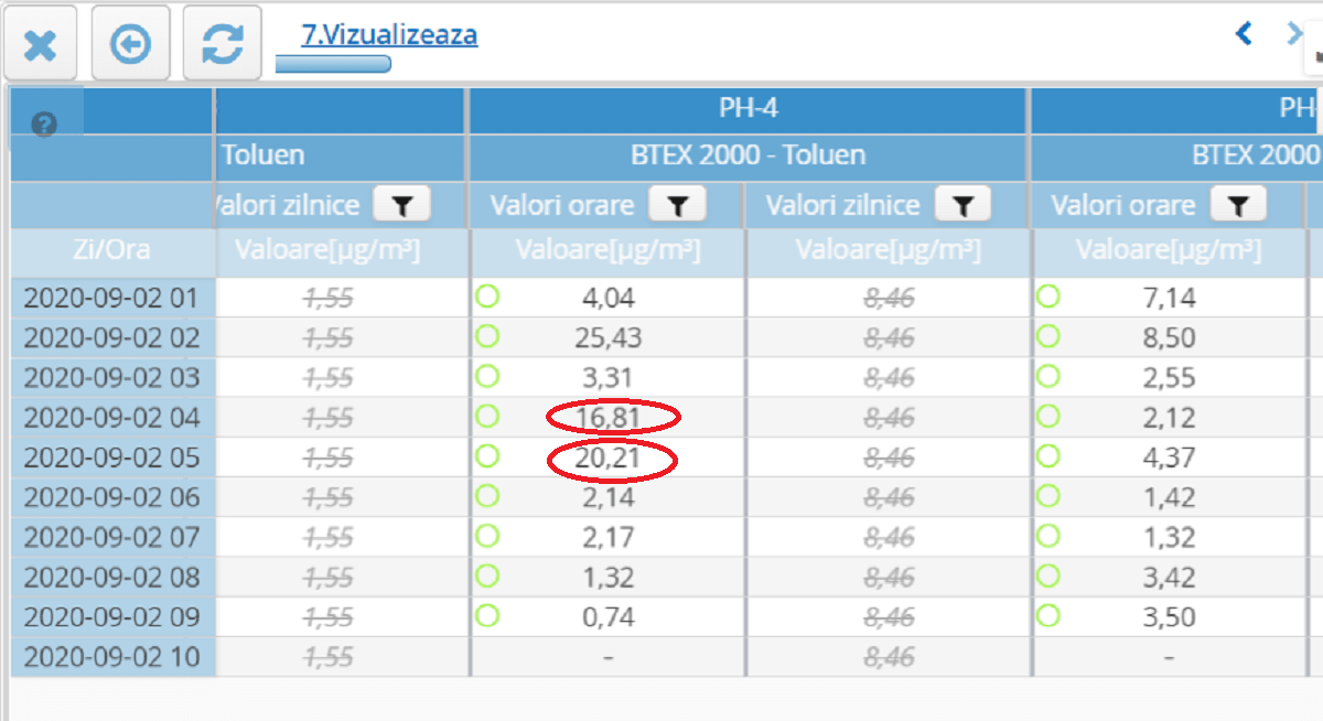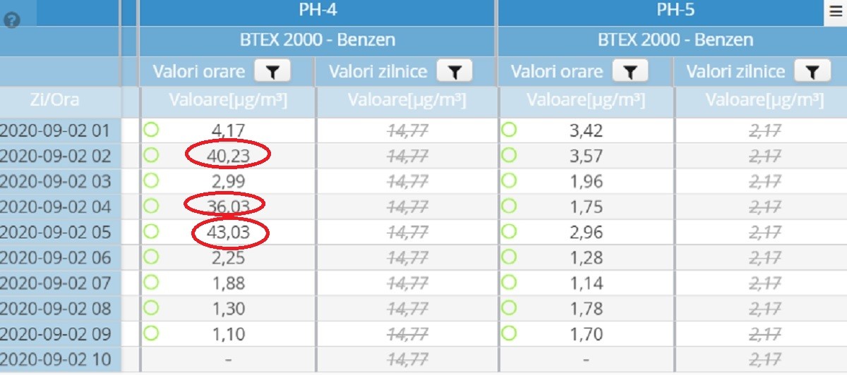 Astfel, în stația de monitorizare PH4, la indicatorul benzen au existat depășiri, pragul maxim fiind înregistrat la ora 05.00 – 43,03 ug/m3, în condițiile în care valoare limită anuală pentru protecția sănătății umane este 5 ug/m3.