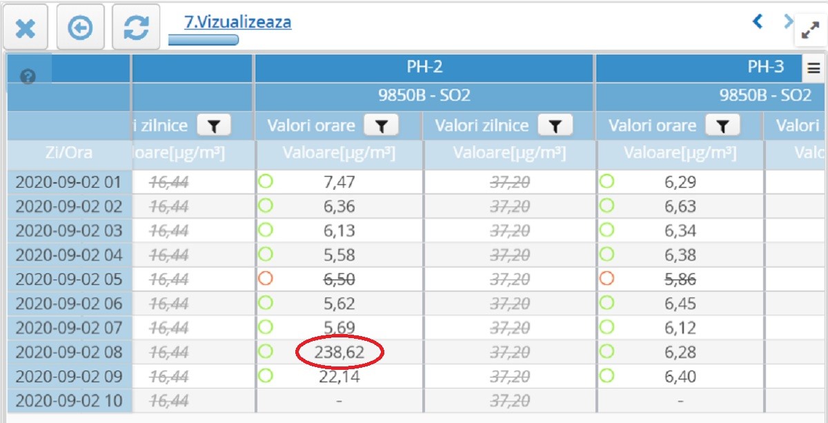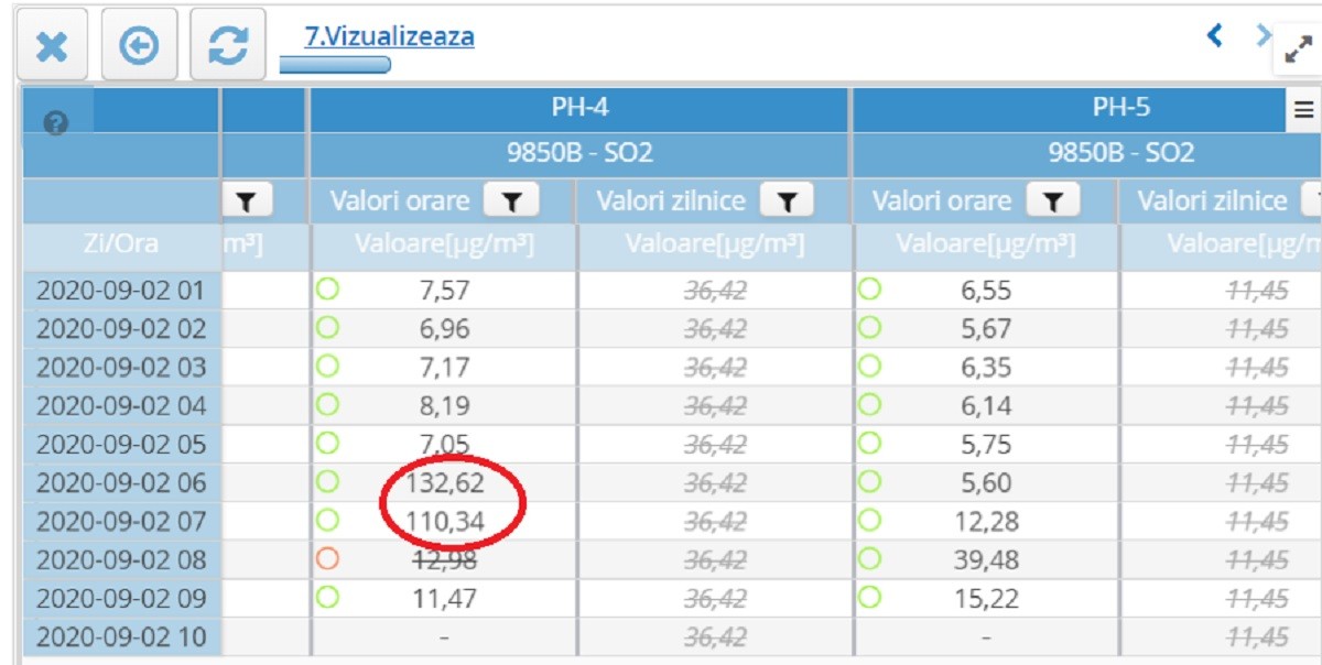 Valoarea maximă la acest indicator (SO2) s-a înregistrat în schimb la ora 08.00, în stația PH2, când s-a ajuns la nivelul de 238,62 ug/m3.