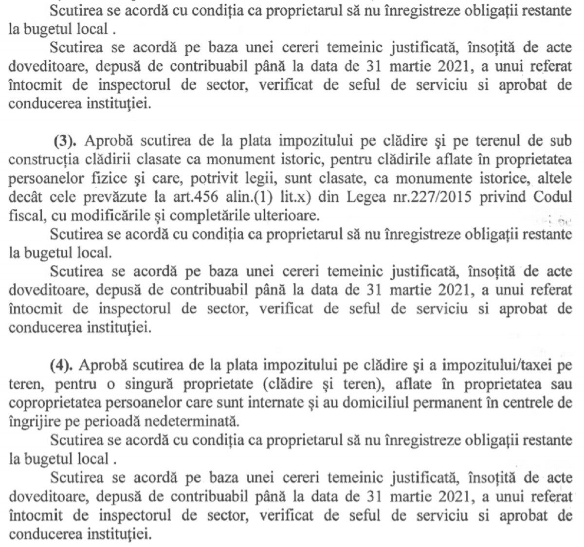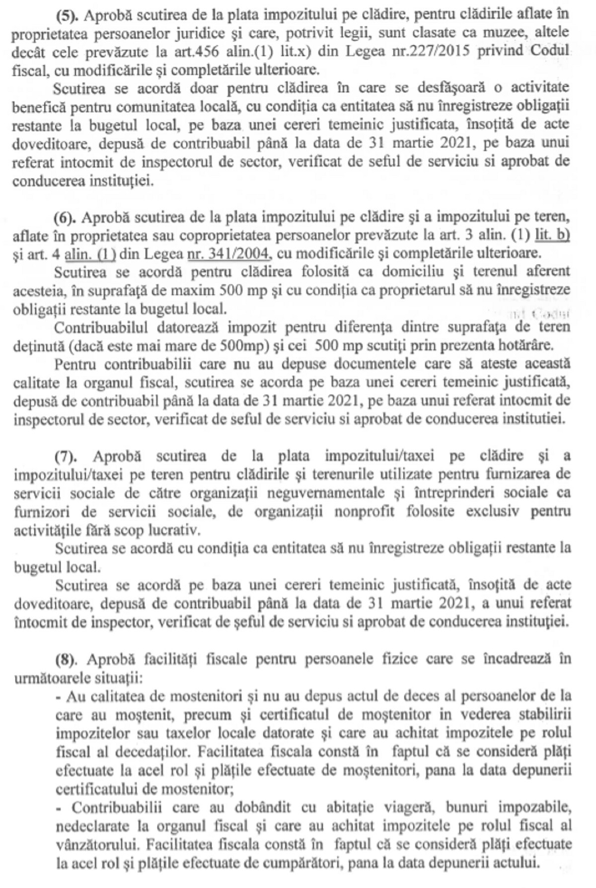 Proiectul de hotărâre mai prevede scutirea de la plată impozitul pe clădire și a impozitului /taxei pe teren, aflate în proprietatea sau în coproprietatea persoanelor căror venituri lunare nete sunt mai mici sau egale de 650 de lei (inclusiv pentru persoanele fără venituri, pentru clădirea folosită ca domiciliu și terenul aferent acesteia, în suprafață de maxim 500 mp.