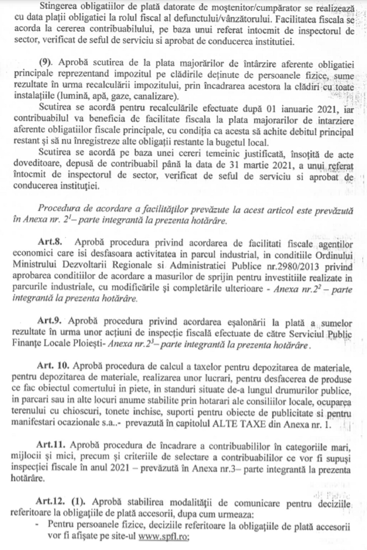 În 2021 se va menține, dacă proiectul de hotărâre al Consiliului Local Ploiești va fi aprobat, bonificația prevăzută pentru plata integrală cu anticipație a impozitelor locale, până la 31 martie de către contribuabili. Astfel, cuantumul bonificației se acordă pentru plata integrală cu anticipație: