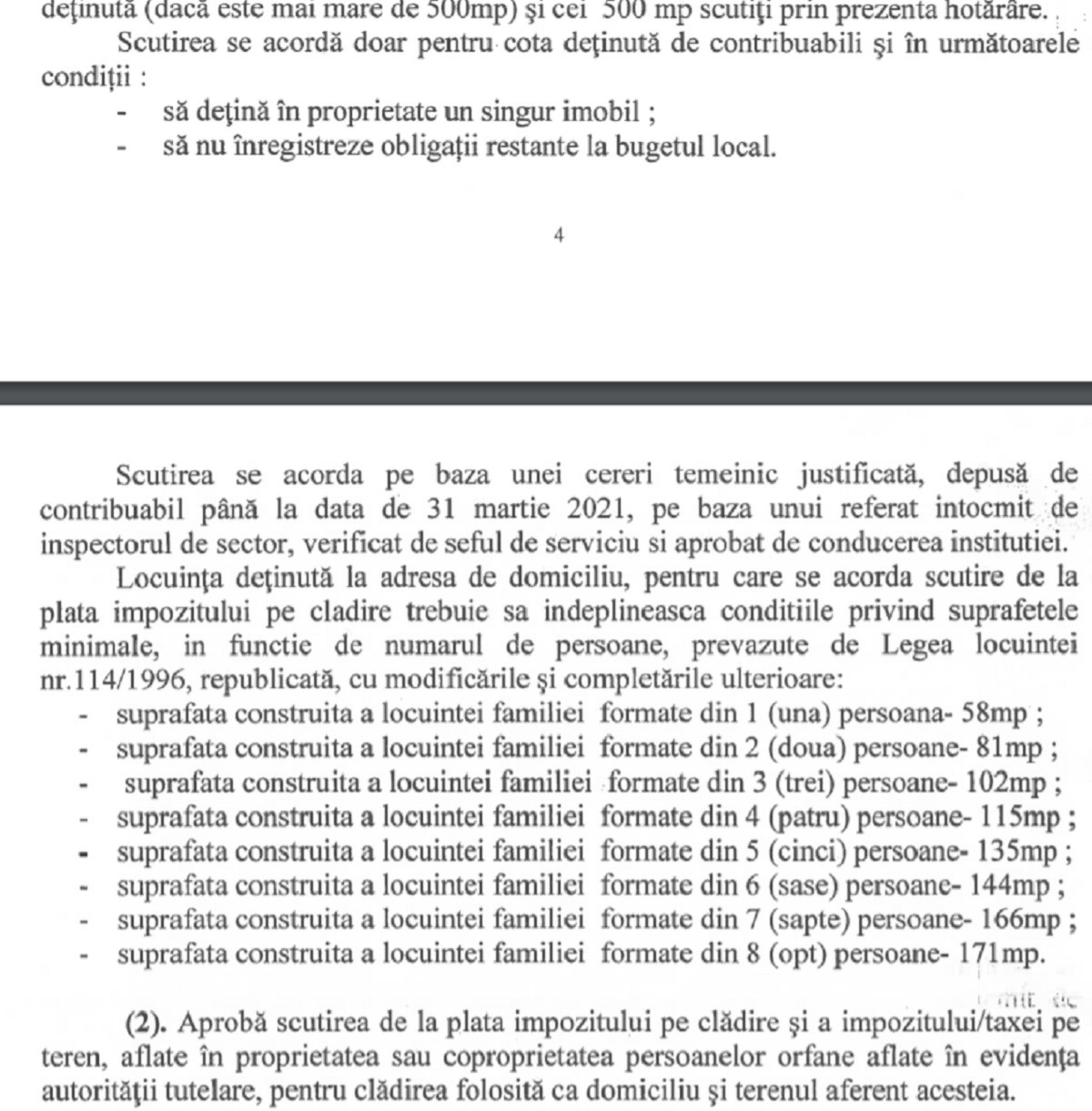 Totodată, locuința deținută la adresa de domiciliu trebuie să întrunească anumite condiții privind suprafețele minimale. Scutirea se aplică și în cazul persoanelor orfane înregistrate la autoritatea tutelară.