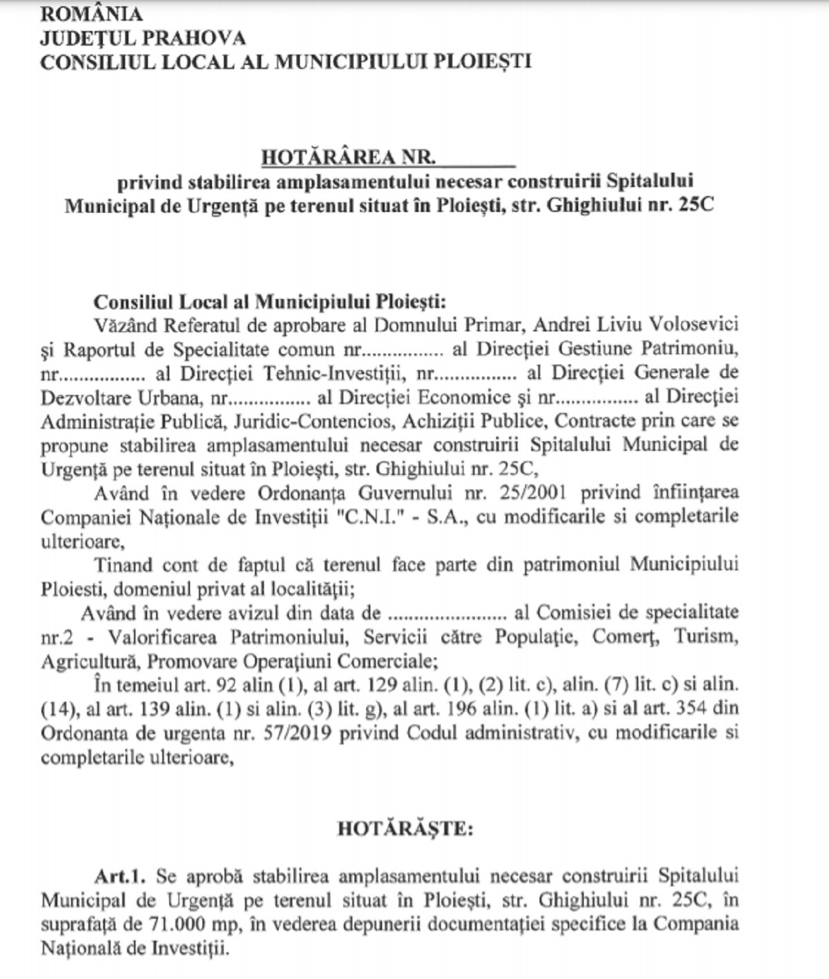 Conform unui proiect de hotărâre avansat pe ordinea de zi a ședinței extraordinare a Consiliului Local Ploiești, se propune „stabilirea amplasamentului necesar construirii Spitalului Municipal de Urgență pe terenul situat în Ploiești, str. Ghighiului nr. 25C, în suprafață de 71.000 mp, în vederea depunerii documentației specifice la Compania Națională de Investiții”.