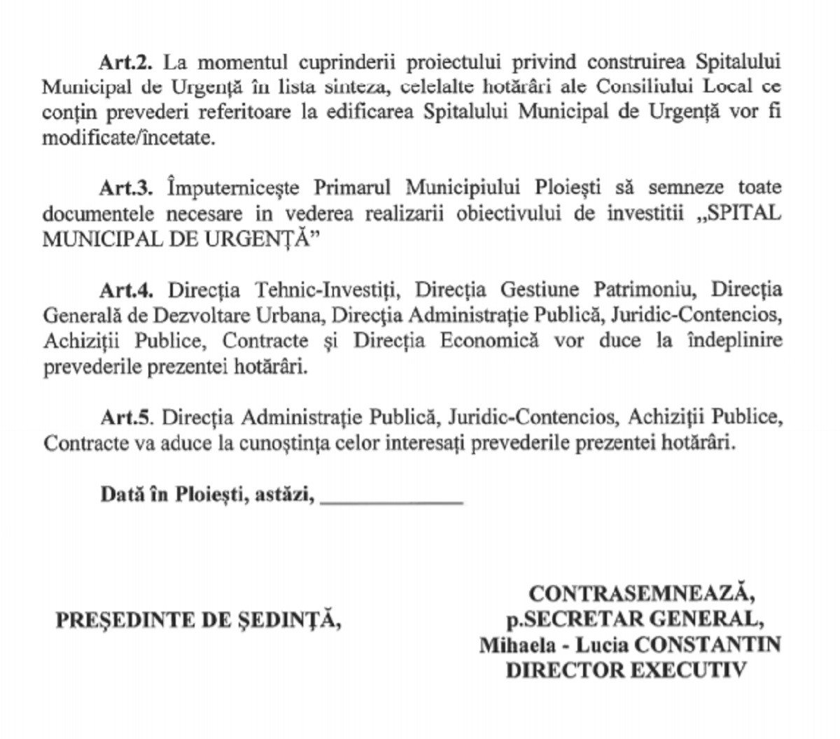 Dacă noul proiect de hotărâre va fi aprobat, „celelalte hotărâri ale Consiliului Local ce conțin prevederi referitoare la edificarea Spitalului Municipal de Urgență vor fi modificate/încetate”, potrivit documentului postat pe site-ul Primăriei Ploiești.