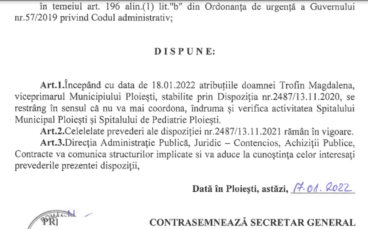 Conform documentului, „începând cu data de 18.01.2022, atribuțiile doamnei Trofin Magdalena viceprimarul Municipiului Ploiești, stabilite prin Dispoziția nr. 2487/13.11.2020, se restrâng în sensul că nu va mai coordona, îndruma și verifica activitatea Spitalului Municipal Ploiești și al Spitalului de Pediatrie Ploiești”, se precizează în dispoziția emisă de primarul municipiului Ploiești.
