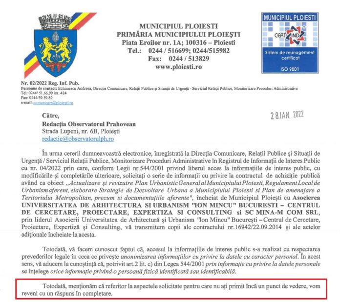 Asta deși, într-un răspuns transmis redacției noastre în 28 ianuarie anul curent referitor la contractul pentru realizarea unui nou PUG, reprezentanții Primăriei Ploiești promiteau că vom primi răspunsurile la întrebările de mai jos: