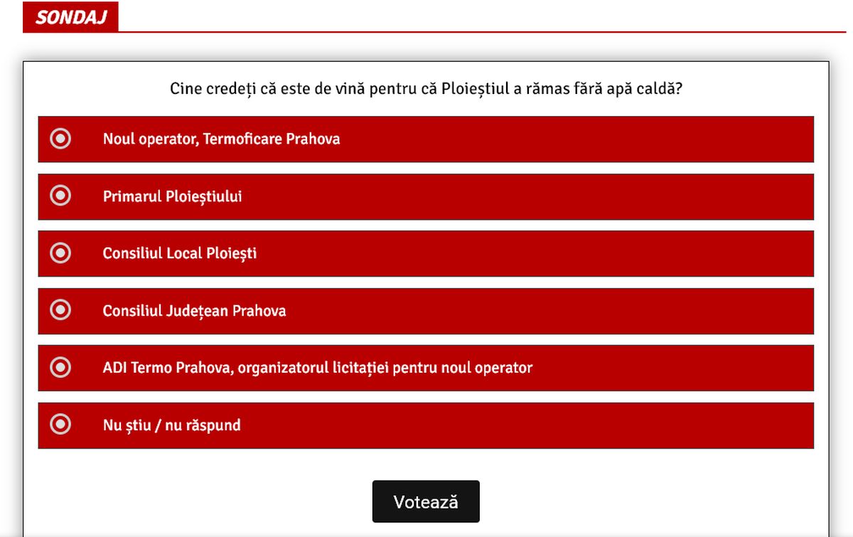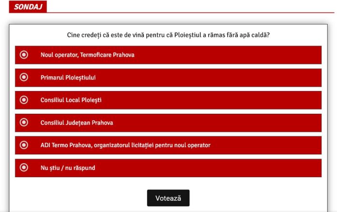 Tot ce trebuie să faceți este să răspundeți la întrebarea ”Cine credeți că este de vină pentru că Ploieștiul a rămas fără apă caldă?” participând la sondajul de la finalul articolului.
