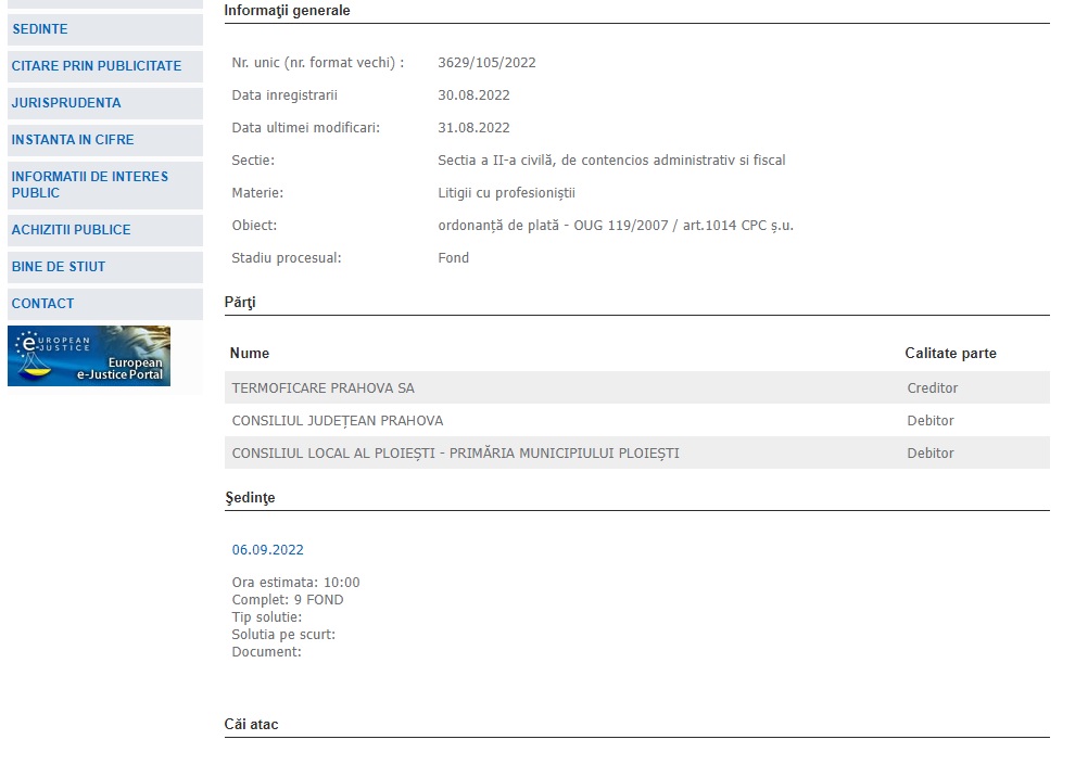 Termoficare Prahova cere Tribunalului Prahova – Secția de Contencios Administrativ și Fiscal să oblige autoritățile locale și județene să plătească subvenția aferentă furnizării apei calde din perioada 13 mai – 1 august.