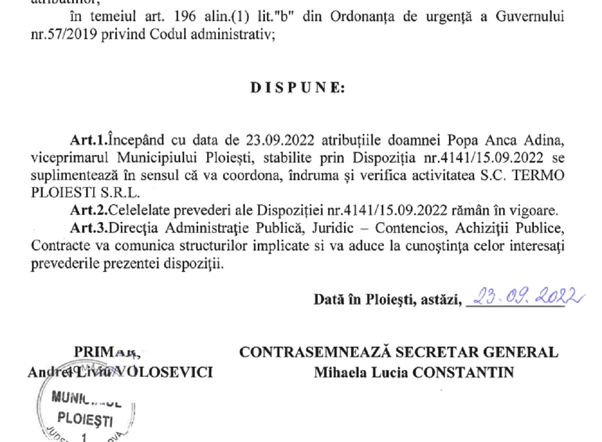 Conform ultimei dispoziții emise vineri, 23 septembrie, „începând cu data de 23.09.2022 atribuțiile doamnei Popa Anca Adina, viceprimarul Municipiului Ploiești, stabilite prin Dispoziția nr. 4141/15.09.2022 se suplimentează în sensul că va coordona, îndruma și verifica activitatea SC Termo Ploiești SRL”.