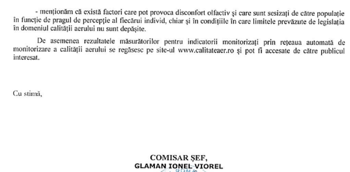 Pe de altă parte, Comisariatul Județean al Gărzii Naționale de Mediu recunoaște că „există factori care pot provoca disconfort olfactiv și care sunt sesizați de către populație în funcție de pragul de percepție al fiecărui individ, chiar și în condițiile în care limitele prevăzute în domeniul calității aerului nu sunt depășite”