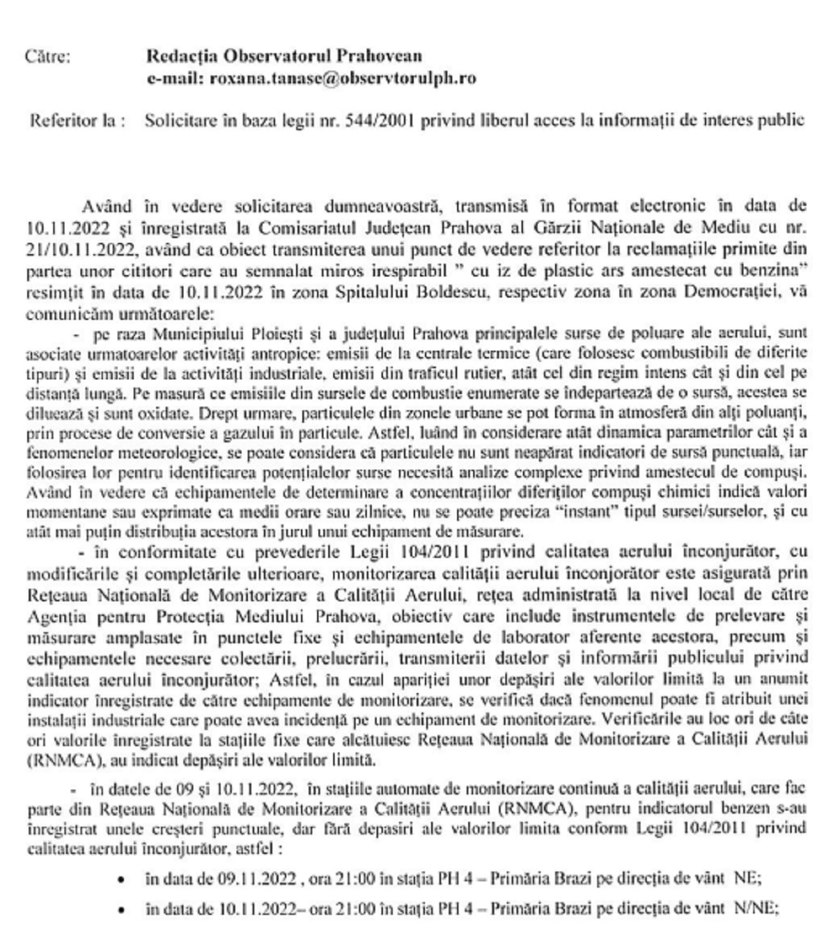 Cu privire la benzen, Comisariatul Județean al Gărzii Naționale de Mediu susține că „s-au înregistrat unele creșteri punctuale, dar fără depășiri ale valorilor limită conform Legii 104/2011 privind calitatea aerului înconjurător(…)”.