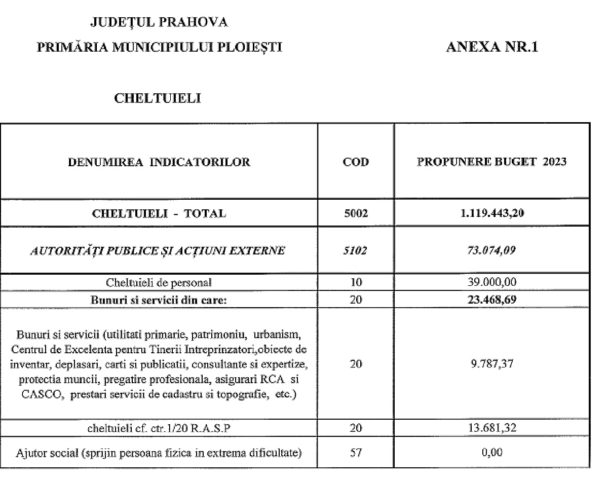 Proiectul de buget pentru 2023 a fost publicat pe site-ul Primăriei Ploiești, la secțiunea „Transparență decizională”, iar conform documentului în 2023 se estimează venituri și cheltuieli în cuantum de peste 1,1 miliarde lei lei.