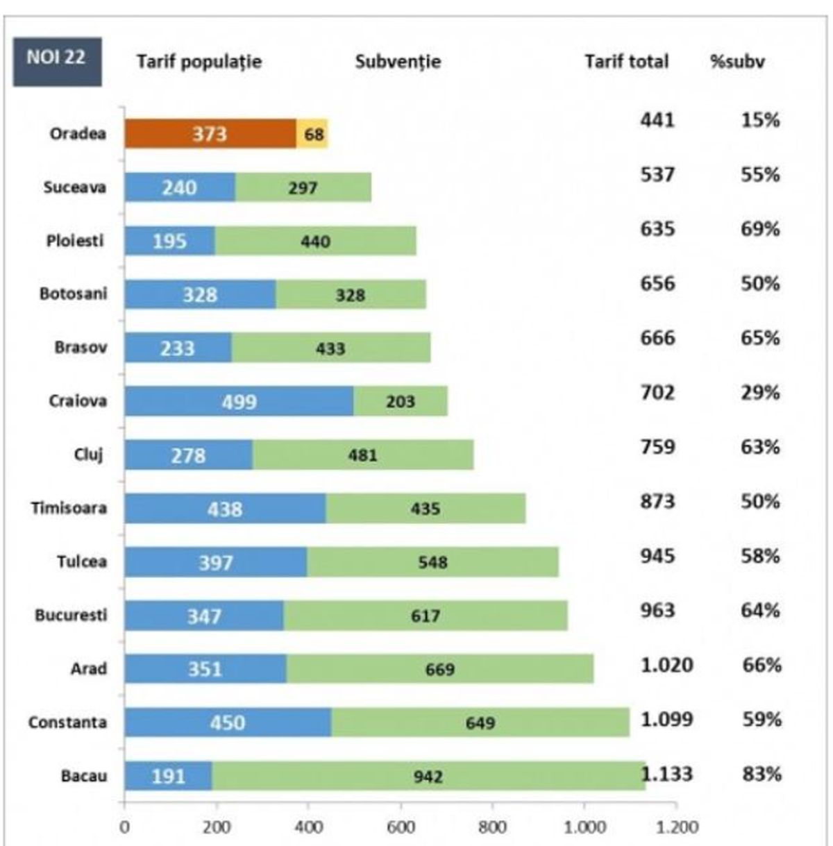 În schimb, subvenția acordată de la bugetul local este mai mică, astfel încât orădenii plătesc 373 de lei/gcal, față de 195 lei/gigacal (fără TVA).