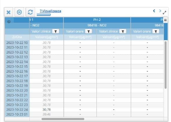 La dioxidul de azot au existat raportări doar în stațiile Ph1, PH6 și PH7, în timp ce, pentru celelalte stații de monitorizare, nu există parametri raportați.