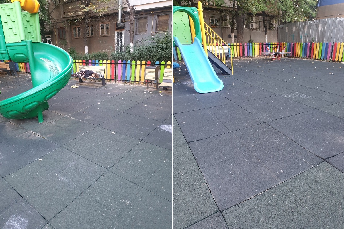 Se vede în imagini cum, prin gardul locului de joacă vegetația crescută în exces năpădește zona parcului. În plus, într-una din imagini, o persoană doarme nestingherită pe una dintre băncile parcului.