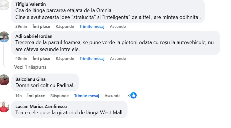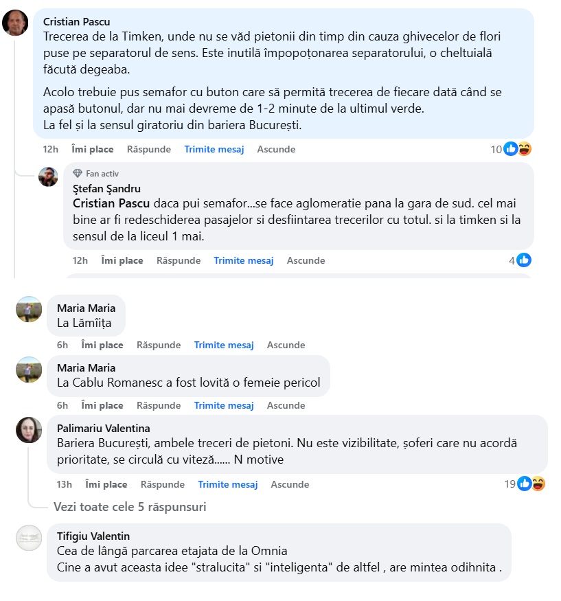 „ Trecerea de la Timken, unde nu se văd pietonii din timp din cauza ghivecelor de flori puse pe separatorul de sens. Este inutilă împopoțonarea separatorului, o cheltuială făcută degeaba.
