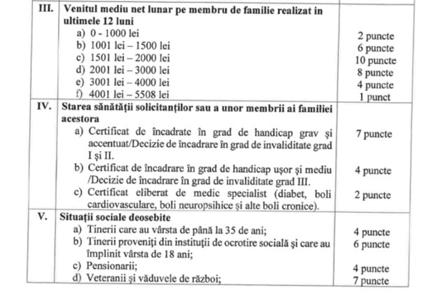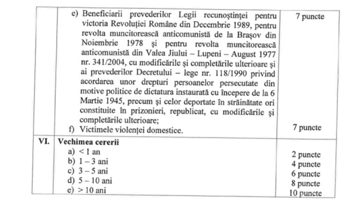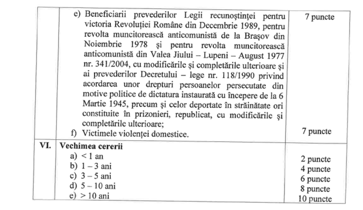 „În cazul înregistrării unor punctaje egale, solicitanții vor fi departajați în funcție de vechimea cererii, luându-se în considerare data efectivă a înregistrării cererii (zi/luna/an), având prioritate solicitantul a cărui vechime e mai mare”, se precizează în proiectul de hotărâre.