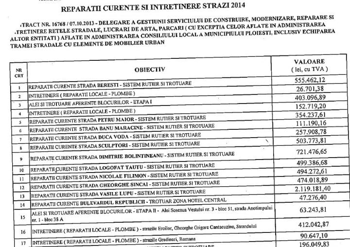 Observatorulph.ro a atras atenția încă de la data semnării contractului asupra prețurilor uriașe acceptate de fosta administrație privind lucrările de reparații străzi și dotare cu mobilier urban. Astfel s-a aflat că PLOIEŞTENII PLĂTESC PENTRU O BANCĂ DIN PARC ECHIVALENTUL UNUI SMART TV 3D, că LA PRIMĂRIA PLOIEŞTI UN COŞ DE GUNOI COSTĂ CÂT 15 PENSII MUNICIPALE sau că PRIMĂRIA PLOIEŞTI VA PLĂTI PENTRU UN WC CÂT PENTRU O GARSONIERĂ.