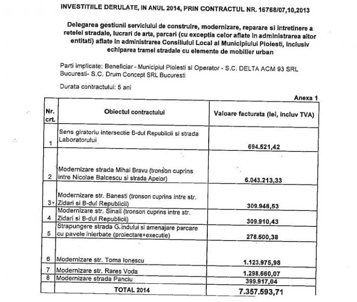 La solicitarea observatorulph.ro, Primăria Ploiești a transmis valoarea lucrărilor prestate de Delta ACM de la semnarea contractului și până acum, plătigte de la bugetul local: