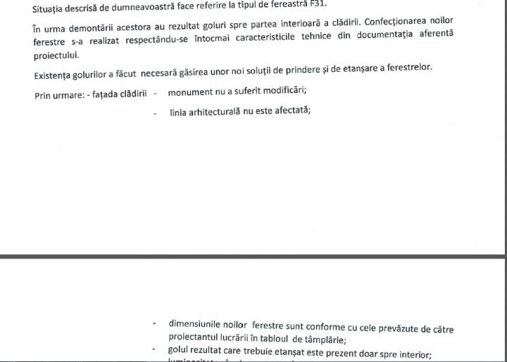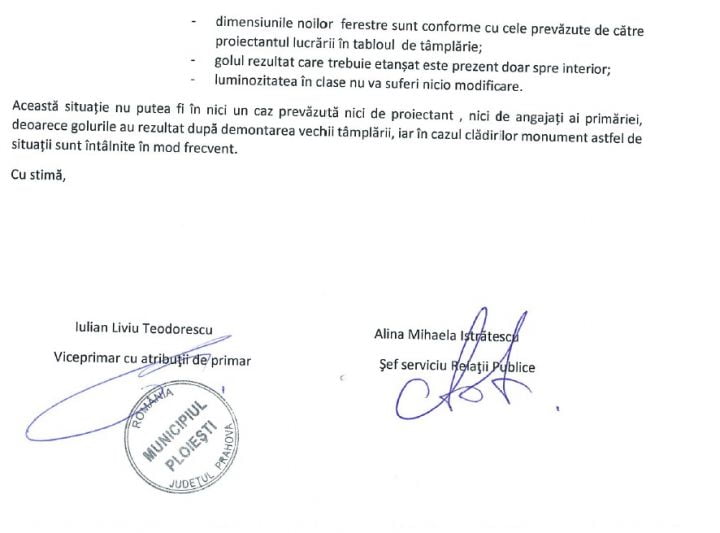 Pe de altă parte, municipalitatea consideră că „Această situație nu putea fi în niciun caz prevăzută nici de proiectant, nici de angajații primăriei, deoarece golurile au rezultat după demontarea vechii tâmplării, iar în cazul clădirilor monument astfel de situații situații sunt întâlnite în mod frecvent”. Prin urmare, nimeni nu va fi tras la răspundere de această situație, în condiiile în care, așa cum recunoaște și municipalitatea, este vorba de o clădire monument. No comment! Iată răspunsul Primăriei Ploiești: