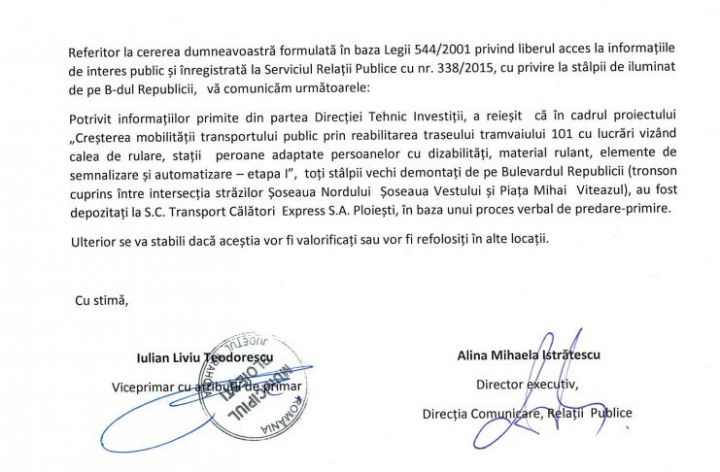 Vezi mai jos adresa Primăriei Ploiești referitoare la destinația stâlpilor de iluminat de pe Republicii