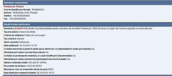 Joia trecută a fost ultima zi de depunere a ofertelor pentru studiul de prefezabilitate la obiectivul de investiții "Penitenciar 1000 de locuri cu regim de maxima sigranta si inchis Berceni". Procedura de achiziție publică, organizată de Penitenciarul Ploiești, este cerere de ofertă, criteriul de selecție fiind prețul cel mai scăzut. Aceasta este prima etapă din procesul de construcție al unei pușcării lângă Ploiești, unde vor fi aduși cei mai periculoși deținuți din România (vezi anunțul de licitație la finalul articolului).