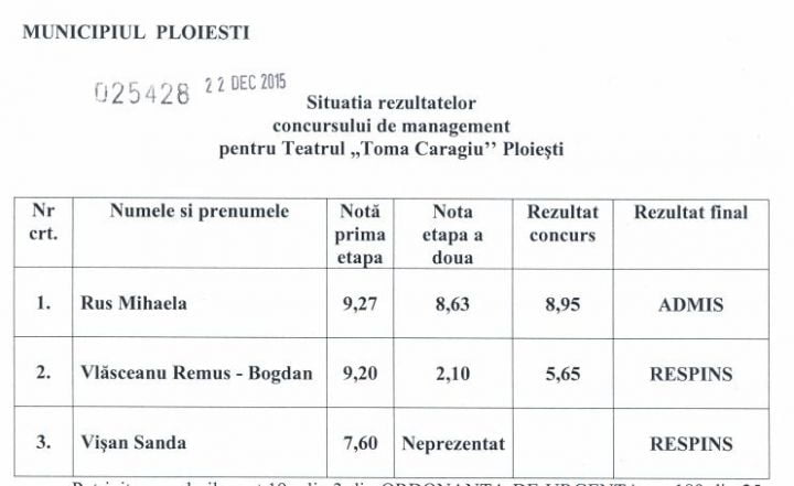 Ieri a avut loc ultima etapă a concursului organizat de Primăria Ploiești pentru postul de director al teatrului Toma Caragiu din Ploiești. Câștigătorul a fost desemnat în persoana Mihaelei Rus, șeful secției teatrului de păpuși. Rezultatul concursului a fost însă contestat de către Sanda Vișan, realizator TVR.