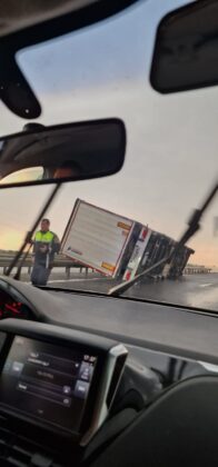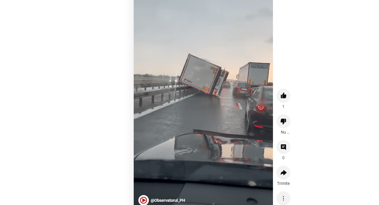 Incident, marți seară, pe Autostrada București-Ploiești (A3). O rafală puternică de vânt a răstunat un tir, în zona localității Gruiu. VIDEO la finalul articolului.