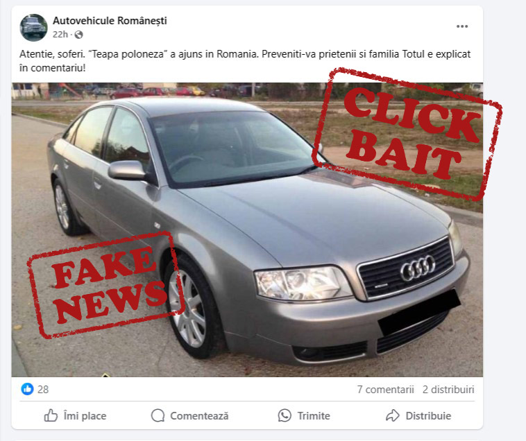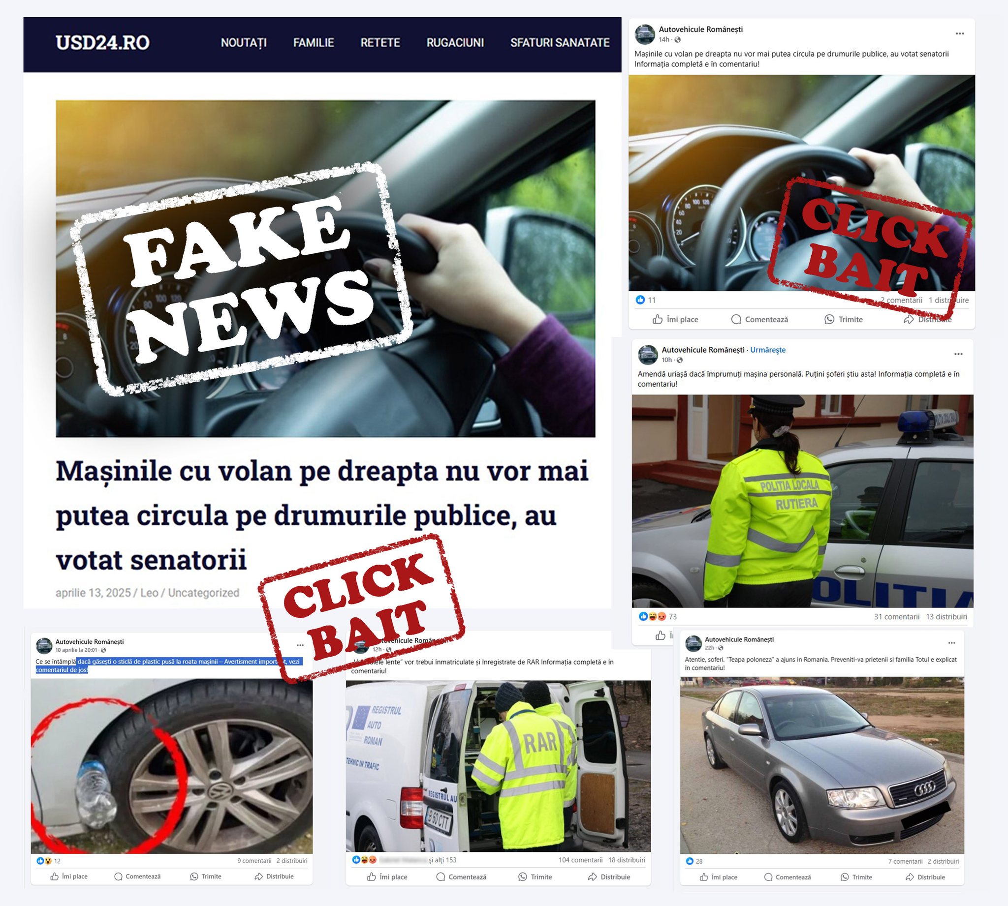 O pagină urmărită de sute de mii de utilizatori a devenit rampă de lansare pentru articolele înșelătoare publicate pe un site creat recent. Printre mașinile de epocă sunt promovate știri false precum modificări “bombă” ale legislației din domeniul rutier, mituri despre mașini sau fenomene închipuite care au șocat șoferii etc.