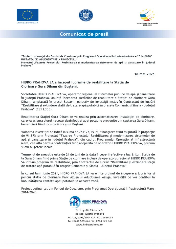 Societatea HIDRO PRAHOVA SA, operator regional al sistemelor publice de apă și canalizare în județul Prahova, anunță începerea lucrărilor de reabilitare a Stației de clorinare Gura Diham, amplasată în orașul Bușteni.