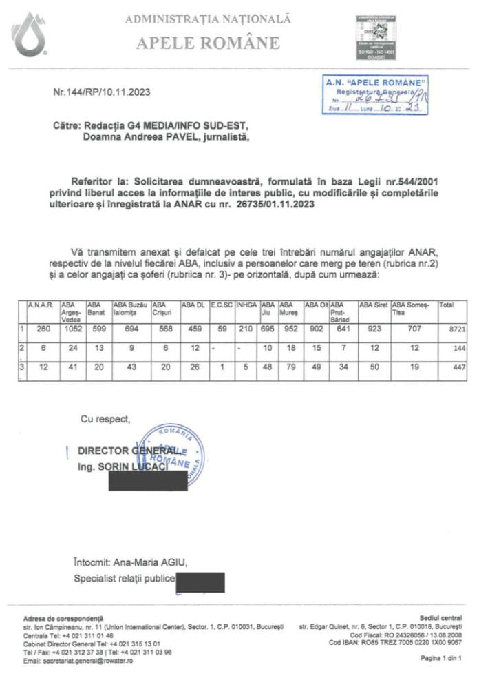 La solicitarea g4media.ro, ANAR a transmis câți angajați are instituția în total, la nivel național, și defalcat pe fiecare administrație bazinală de apă subordonată, câți din aceștia sunt inspectori care merg pe teren și câți sunt șoferi.