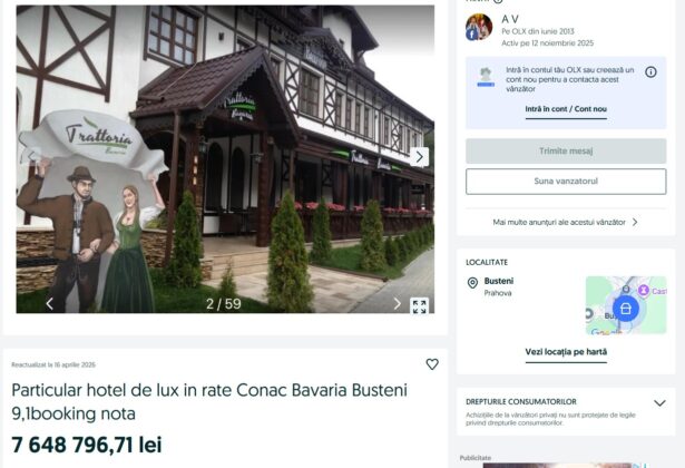 Un alt hotel, Conac Bavaria Bușteni, care are note mari pe Booking, este scos la vânzare pentru suma de 7.648.796,71 lei