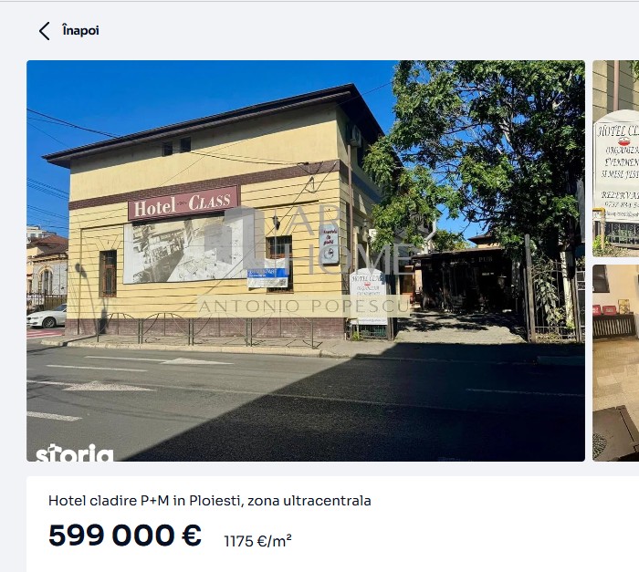 Tot în Ploiești, Hotel Clas, clădire P+M în Ploiești, de pe strada Ana Ipătescu, poate fi cumpărat cu 599.000 de euro, adică la un preț de 1175 euro/mp.