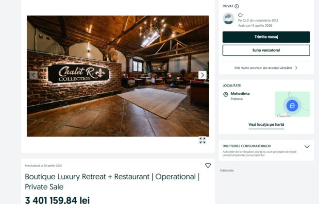 De exemplu, un boutique Luxury Retreat cu restaurant, construit în Mehedința, este scos la vânzare cu 3.401.159,84 lei.