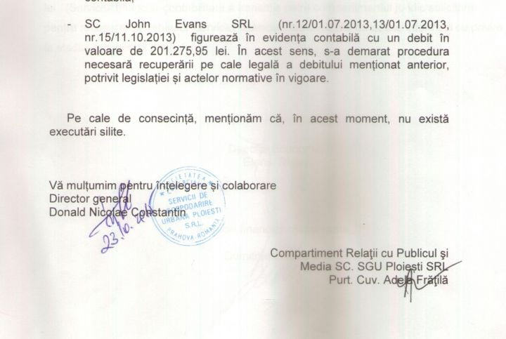 La solicitarea observatorulph.ro, conducerea SGU Ploiești a transmis că firma John Evans SRL, cu care a încheiat contracte de închiriere a spațiilor comerciale în iulie 2013, a acumulat datorii de 201.275 lei. În condițiile în care chiria percepută este modică, 2 euro/mp, se pare că firma respectivă nu a plătit de luni bune chiria către administratorul stadionului.