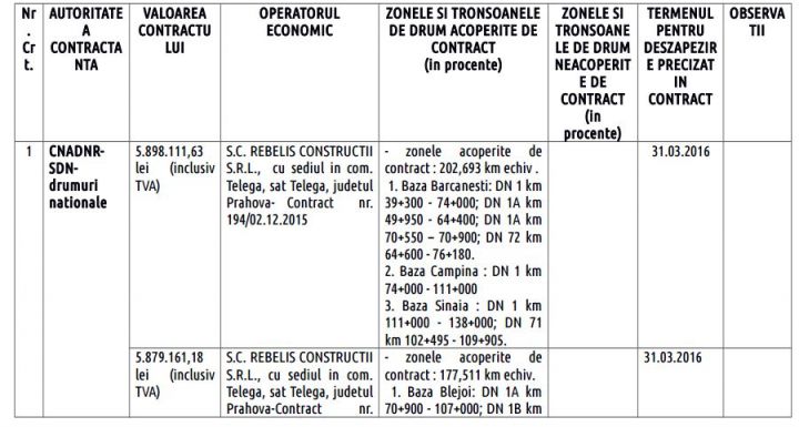 Vezi mai jos situația completă a contractelor pentru deszăpezirea drumurilor naționale și A3 în Prahova făcută publică de Prefectură: