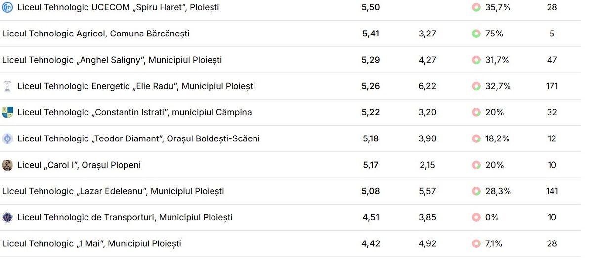 • Liceul Tehnologic de Transporturi, Ploiești – media 4,51, rată de promovare 0%, 10 candidați.