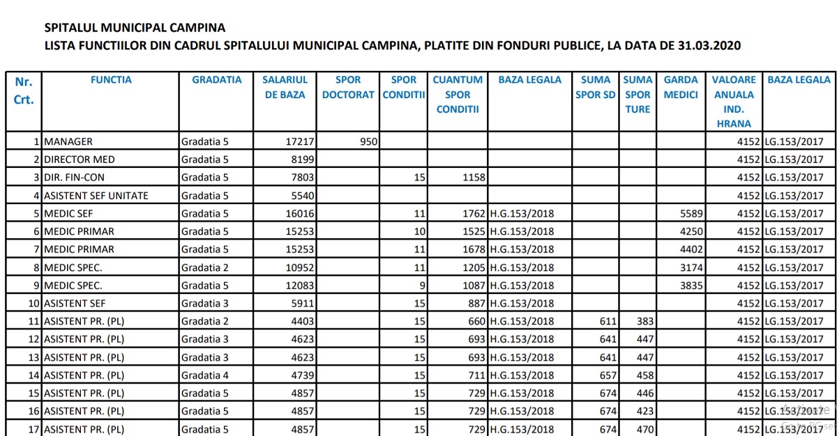 Lista cu privire la funcțiile publice plătite din fondurile publice, la data de 31 martie 2020, a fost postă pe site-ul Spitalului Municipal Câmpina, fiind detaliate explicit salariile de bază, sporurile, precum, sumele aferente gărzilor, și suma anuală aferentă indemnizației de hrană.