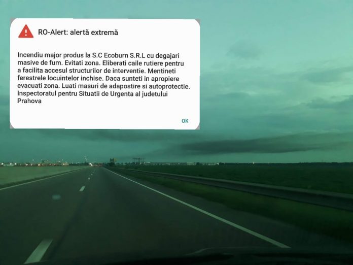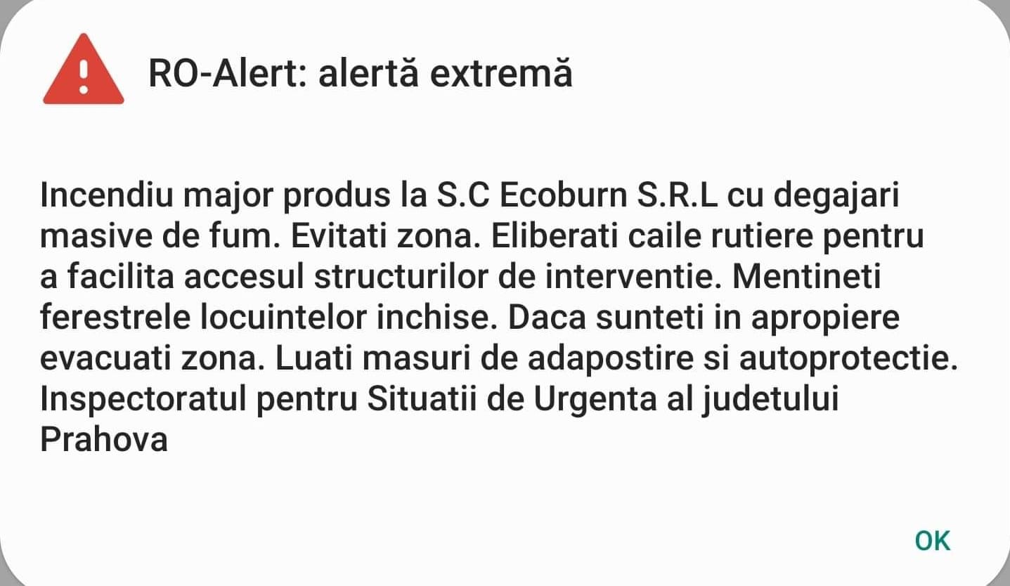 ”Incendiu major produs la SC ECOBURN SRL, cu degajări masive de fum. Evitați zona! Eliberați căile rutiere pentru a facilita accesul structurilor de intervenție. Mențineți ferestrele locuințelor închise. Dacă sunteți în apropiere, evacuați zona. Luați măsuri de adăpostire și autoprotecție!”