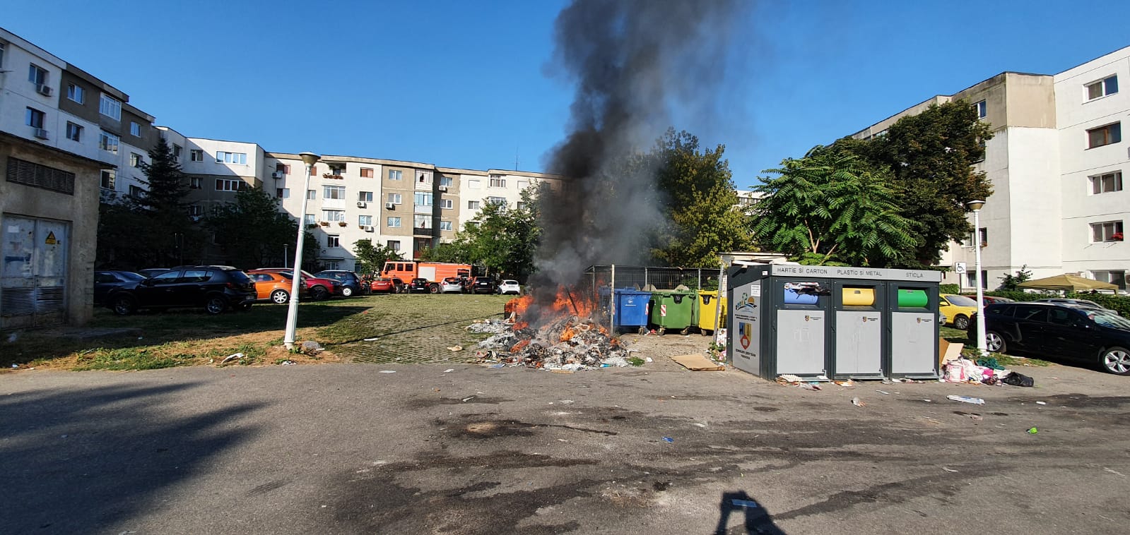 A fost panică, marți seară, într-o parcare din Ploiești. Persoane necunoscute au incendiat gunoiul depozitat lângă platforma de deșeuri dintre blocuri. FOTO-VIDEO la finalul textului.