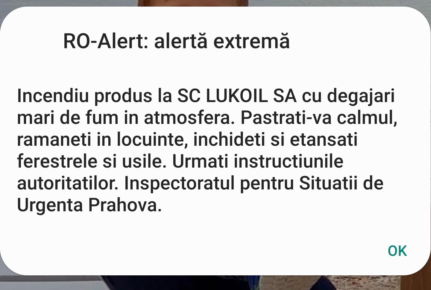 RO-ALERT: alertă extremă. Incendiu produs la SC LUKOIL SA cu degajări mari de fum în atmosferă. Păstrați-vă calmul, rămâneți în locuințe, închideți și etașați ferestrele și ușile. Urmați instrucțiunile autorităților. Inspectoratul pentru Situații de Urgență.”