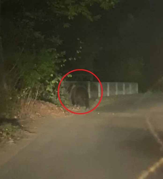 În imaginile surprinse luni seară se vede cum ursul, un exemplar adult, de dimensiuni peste medie, aleargă pe marginea drumului, apoi dispare într-o curte.