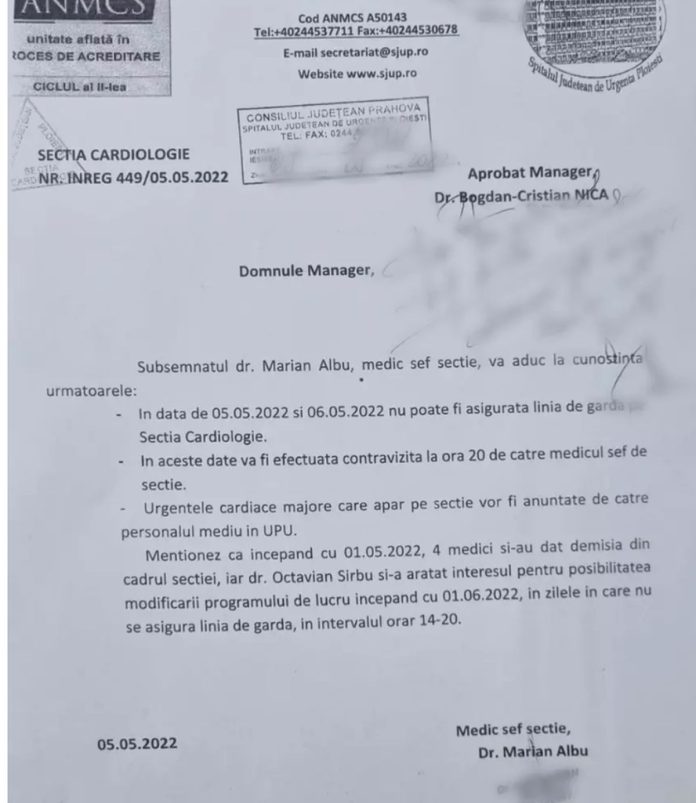 Într-un document intern semnat de șeful secției de cardiologie a spitalului din Ploiești, dr. Marian Albu, și publicat de Libertatea, se arată că ”În data de 05.05.2022 și 06.05.2022 nu poate fi asigurată linia de gardă pe Secția Cardiologie”. Situația este și mai gravă deoarece nu se poate asigura linia de gardă nici măcar la Terapie Intensivă.