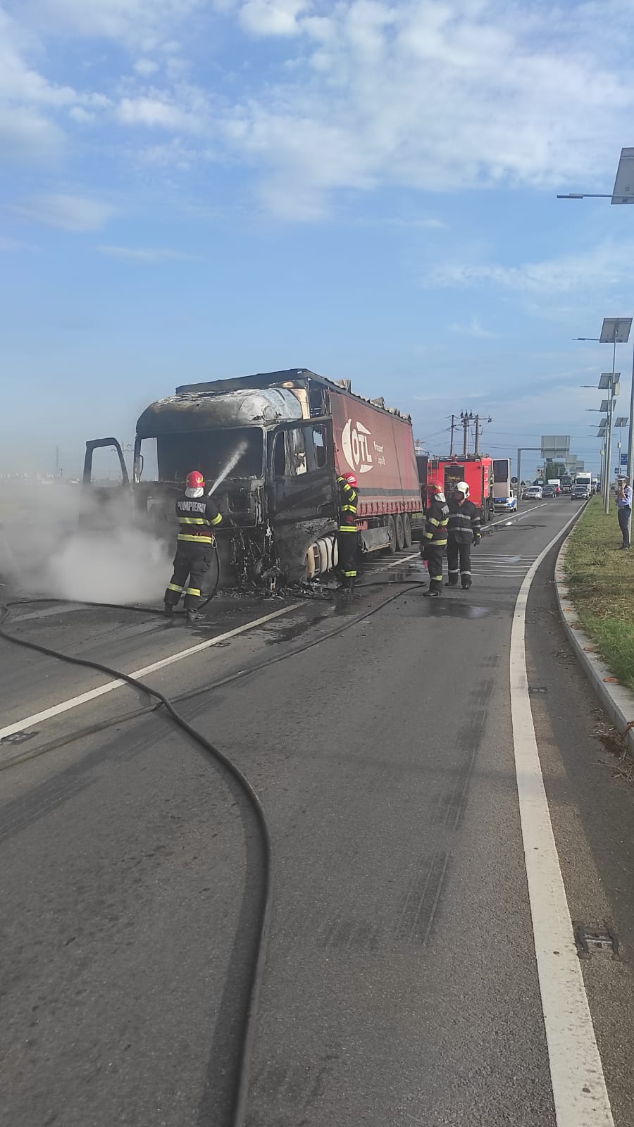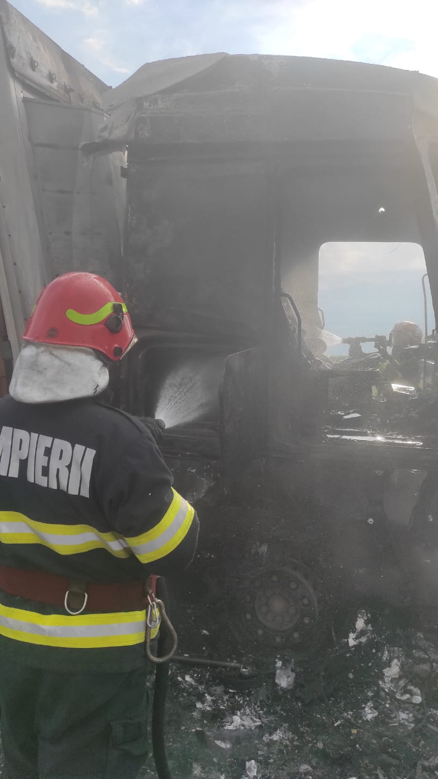 La fața locului intervin două echipaje de pompieri și un echipaj SMURD. Flăcările s-au extins și la remorca TIR-ului care este încărcată cu cărămidă.