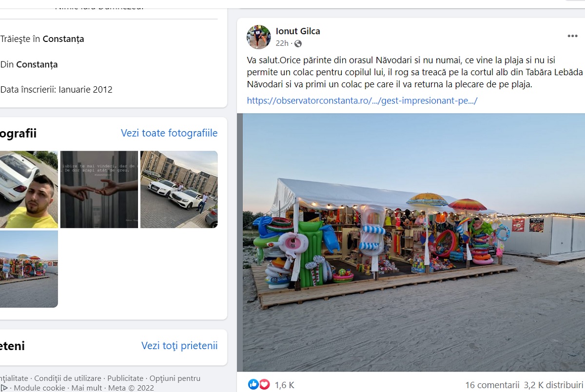„Vă salut. Orice părinte din orasul Năvodari si nu numai, ce vine la plajă și nu isi permite un colac pentru copilul lui, îl rog sa treacă pe la cortul alb din Tabăra Lebăda Năvodari și va primi un colac pe care îl va returna la plecare de pe plaja”, a scris Ionuț Gilca pe Facebook.