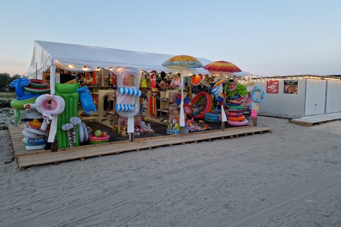 Pe plaja din Năvodari un om de afaceri local, care are un cort cu produse de plajă, le oferă împrumut gratuit accesorii gonflabile celor care nu-și permit să cumpere.