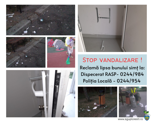 Totodată, facem apel la toți cetățenii ca, în cazul în care observă persoane lipsite de bun simț care vandalizează perimetrele verzi, mobilierul urban, toaletele publice și obiectele de joacă/fitness să apeleze numerele de telefon ale Dispeceratului RASP(0244/984) și Poliției Locale (0244/954) pentru a sesiza aceste aspecte.” au precizat reprezentanții societății într-un comunicat de presă.