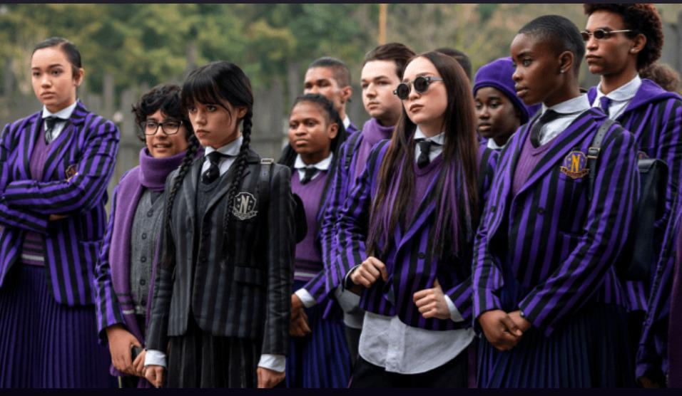 Producția regizată de Tim Burton s-a filmat în România, castelul Cantacuzino fiind chiar internatul Nevermore (locul principal al acțiunii), iar în multe cadre sunt imagini de la Universitatea Politehnică, de la Grădina Botanică sau de la Casa Monteoru. Mai apar imagini de la Gara Regală din Sinaia, dar și de la conacul Olga Greceanu, de la lângă București.