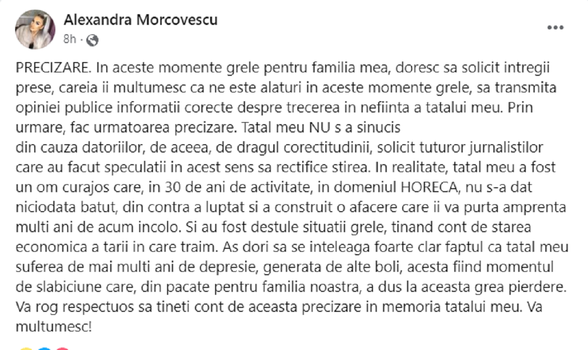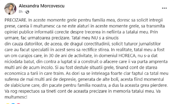 „PRECIZARE. In aceste momente grele pentru familia mea, doresc sa solicit intregii prese, careia ii multumesc ca ne este alaturi in aceste momente grele, sa transmita opiniei publice informatii corecte despre trecerea in nefiinta a tatalui meu. Prin urmare, fac urmatoarea precizare.