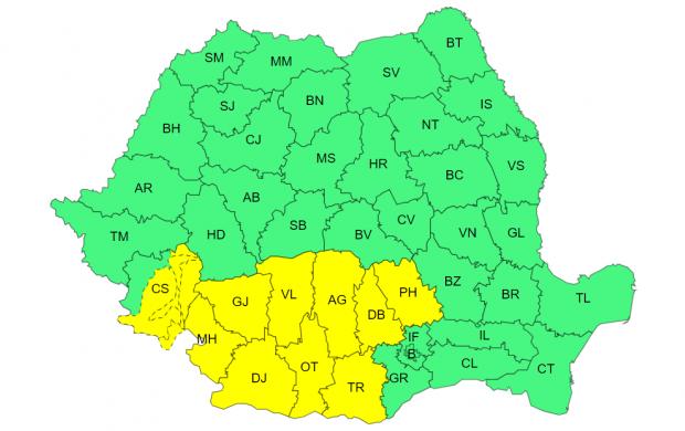 Potrivit ANM, vineri, până la ora 23.00, este cod galben de furtuni în Oltenia, în vestul şi nord-vestul Munteniei şi în sudul Banatului.
